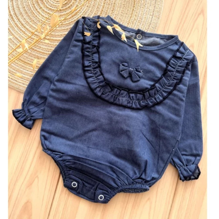 سیسمونی نوزادی دخترانه پیراهن زیردکمه مجلسی جین آبی پاپیون دار
