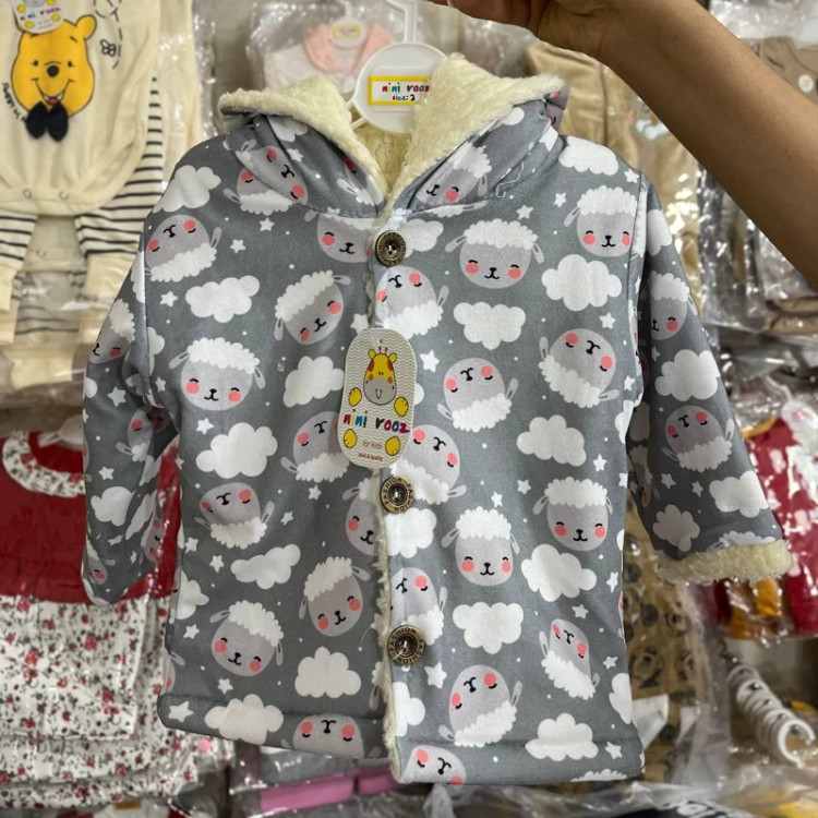 سیسمونی نوزادی کاپشن خز دار طرح ببعی طوسی (لباس گرم نوزادی)