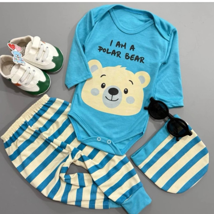 سیسمونی نوزادی پسرانه زیردکمه و شلوار و کلاه خرس آبی