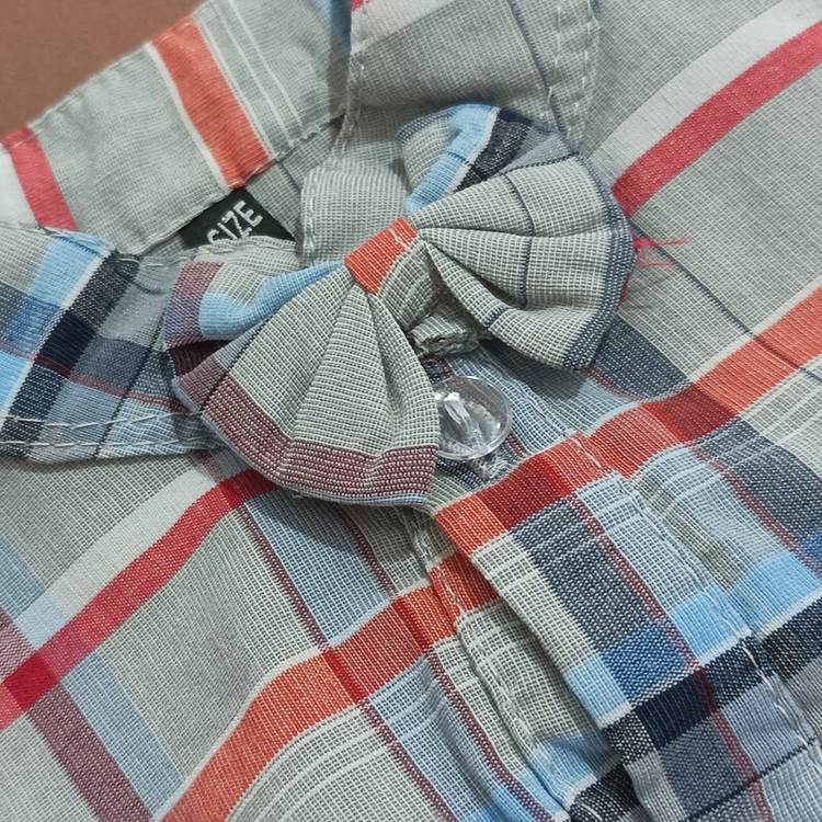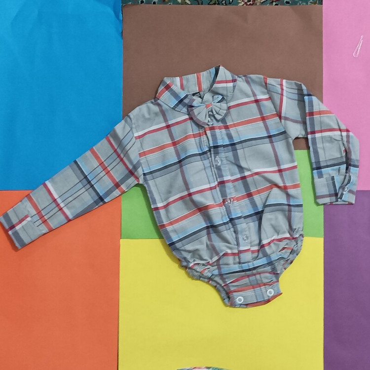 سیسمونی نوزادی پسرانه پیراهن زیردکمه مجلسی (بادی مجلسی) چارخونه طوسی پاپیون دار
